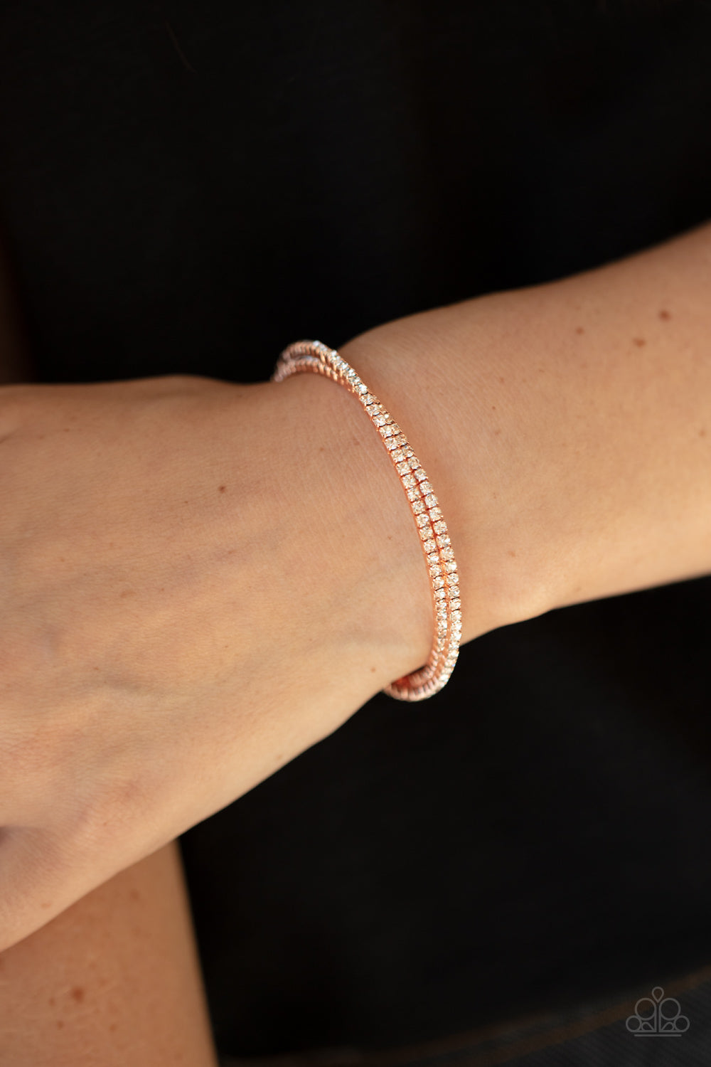 Featuring shiny copper fittings, two rows of glittery white rhinestones delicately twist into a dainty cuff around the wrist.