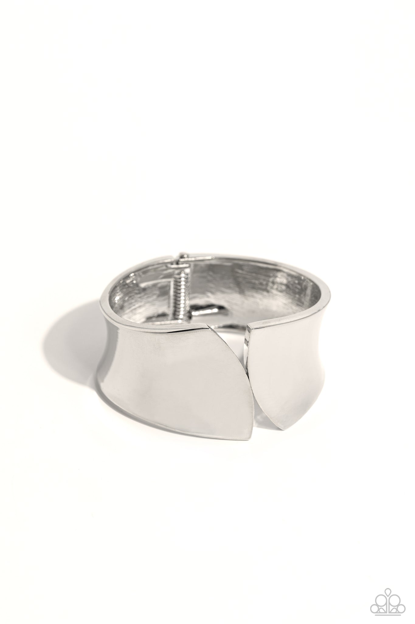A thick band of high-sheen silver, with its edges seemingly sheared off, creates a sharp, edgy cuff-like bracelet around the wrist. Features a hinged closure.