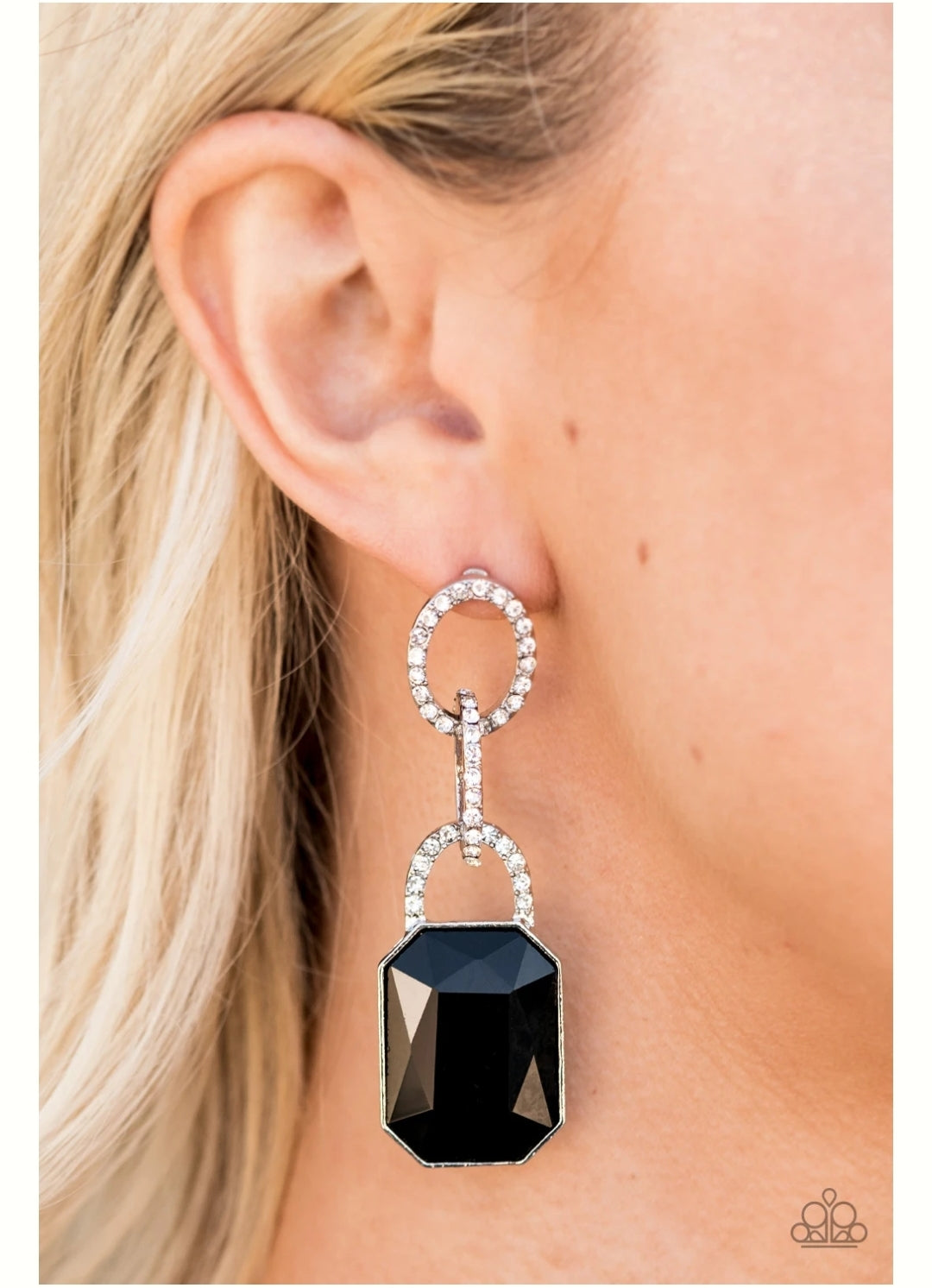 An oversized black emerald-cut rhinestone swings from the bottom of white rhinestone encrusted links, creating a gorgeously dramatic lure. Earring attaches to a standard post fitting.