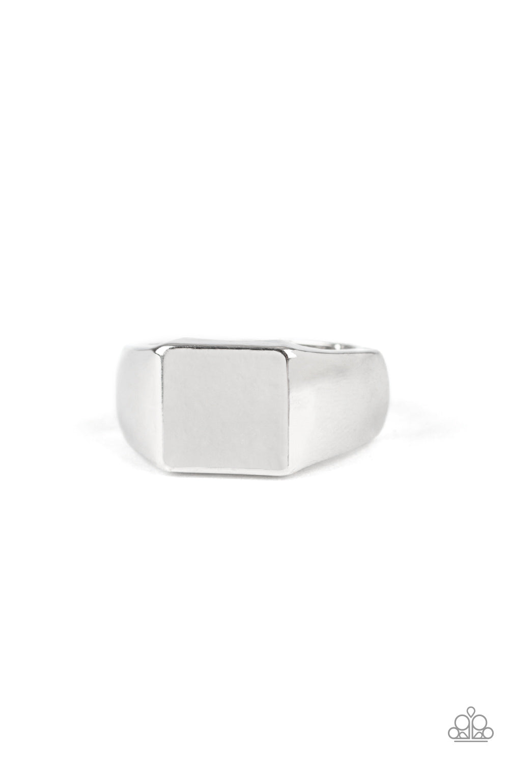 The center of a thick silver band has been smashed into a flat square center for a casual look. Features a shortened stretchy band for a flexible fit. Intended to be worn on the pinky finger.
