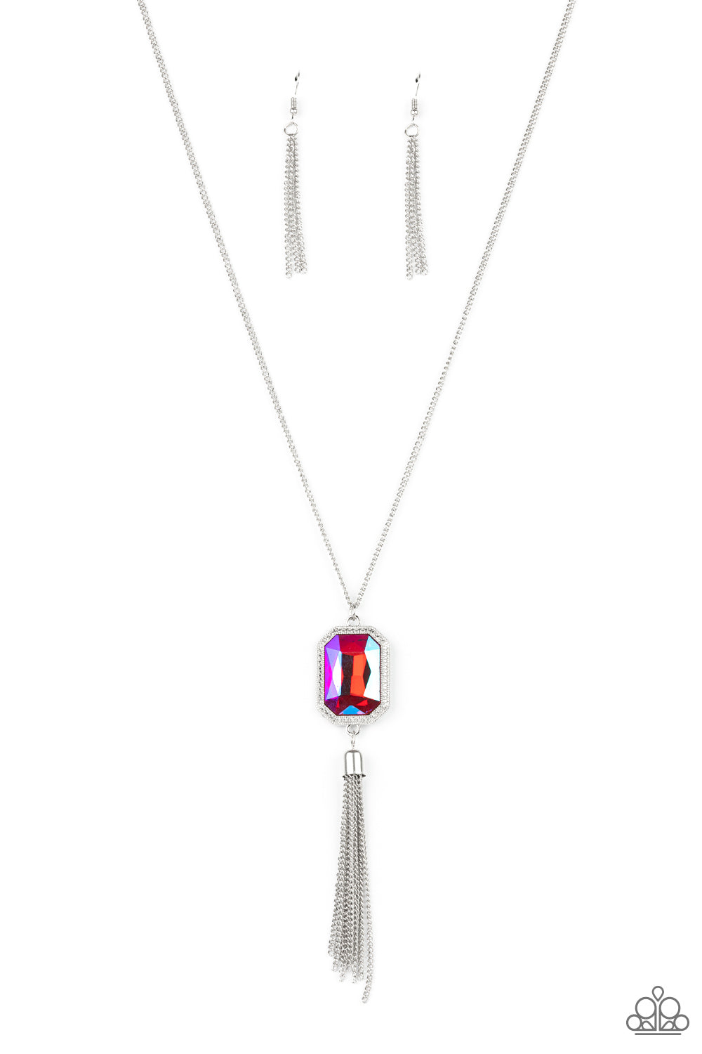 An impressive pink emerald cut gem is pressed into the center of a silver studded frame, creating an ethereal pop of color at the bottom of a lengthened silver chain. A silver chain tassel swings from the bottom of the pendant, adding flirtatious movement to the opulent display. Features an adjustable clasp closure.
