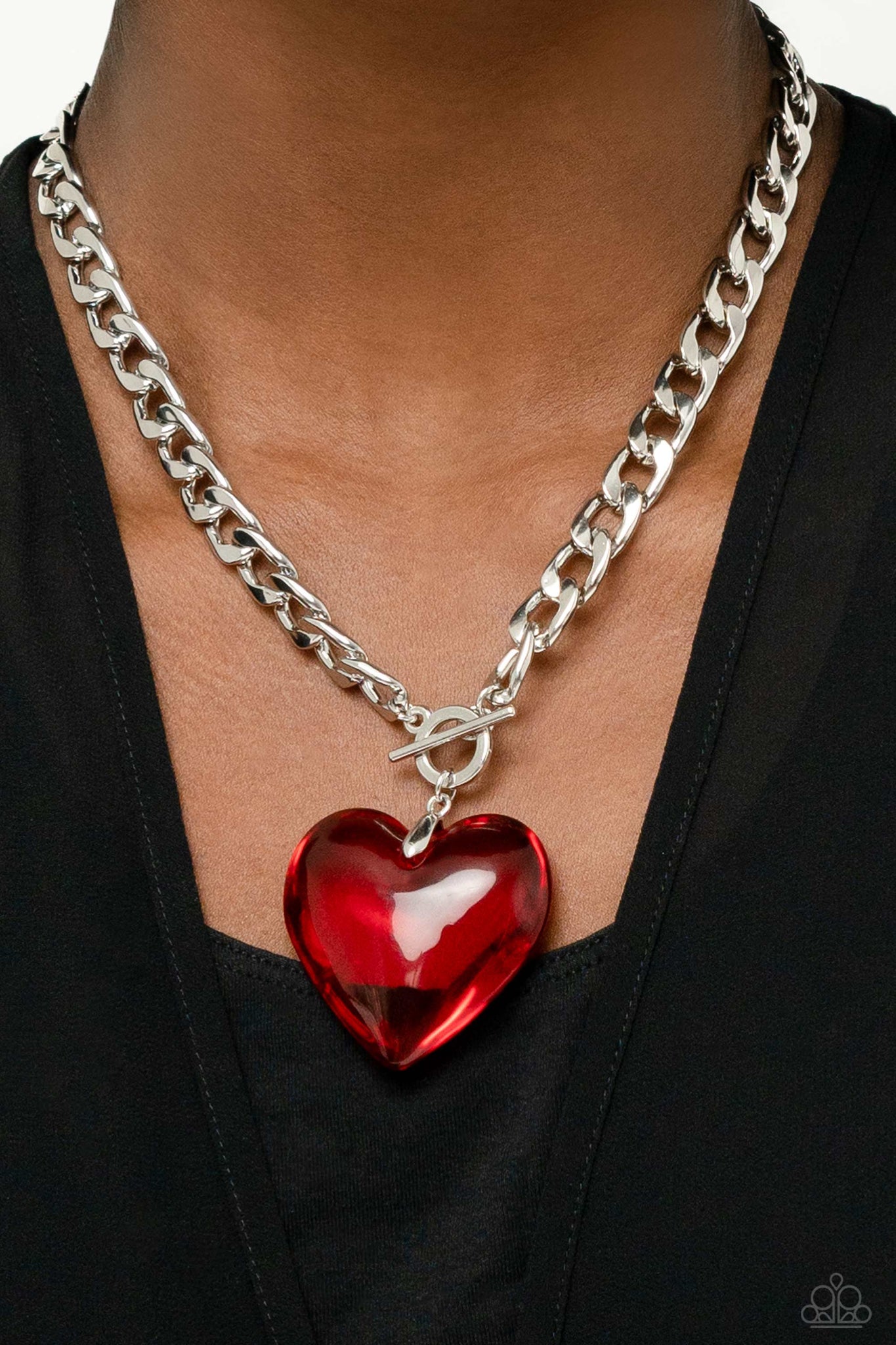 Featuring a glossy finish, an oversized, rich, red heart gem swings from the bottom of a thick silver curb chain below the collar for a romantic declaration. Features a toggle closure.