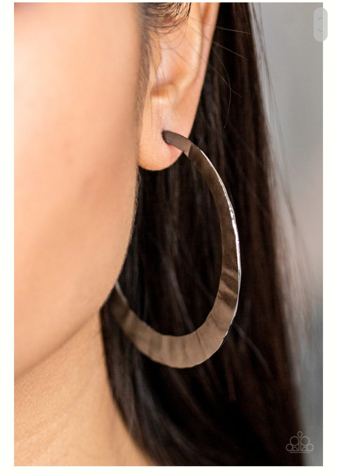 Brushed in a high-sheen finish, a delicately hammered gunmetal hoop curls around the ear for a fierce look. Earring attaches to a standard post fitting. Hoop measures 2 1/2" in diameter.